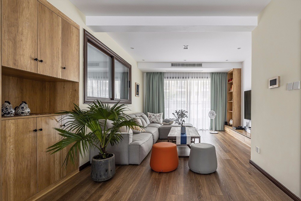 客廳利用半墻加窗戶的形式與書房連接,并在沙發(fā)背景墻左側(cè)利用書房空間做成了儲(chǔ)物柜,將行李箱安置地妥妥的,中部留空的設(shè)計(jì)便于小物件的取放。