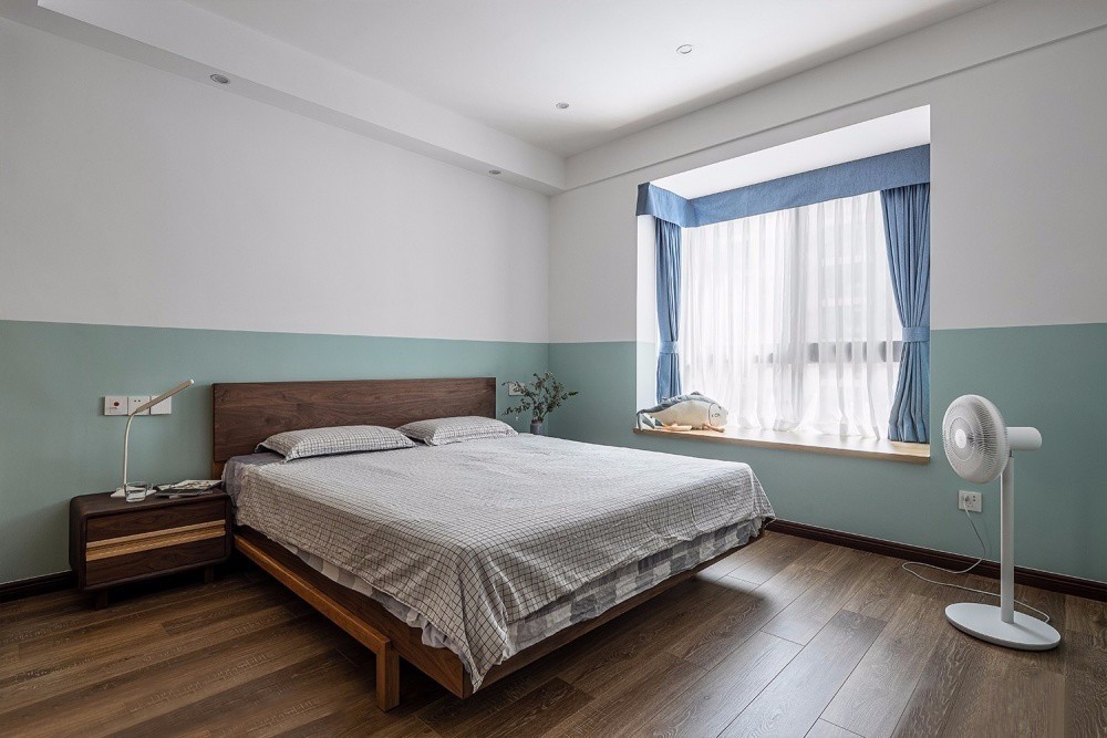 主臥墻面采用白色與淺綠色上下分色的涂刷效果,形成獨(dú)特的圍和感。簡潔舒適的灰調(diào)床品,營造寧靜安逸的睡眠氛圍。加入綠植的點(diǎn)綴,帶來清新自然的味道。