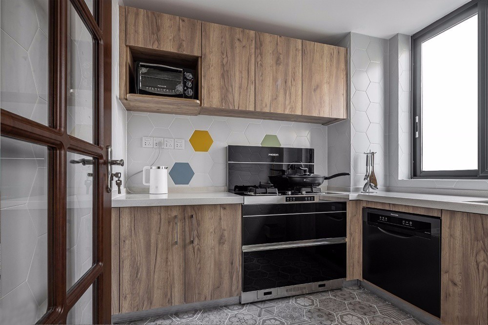 廚房墻面鋪設(shè)淺灰色六角磚,點(diǎn)綴藍(lán)色黃色與綠色,為空間增添了跳躍靈動(dòng)感。與木質(zhì)櫥柜完美結(jié)合,簡約自然中透露著精致感。