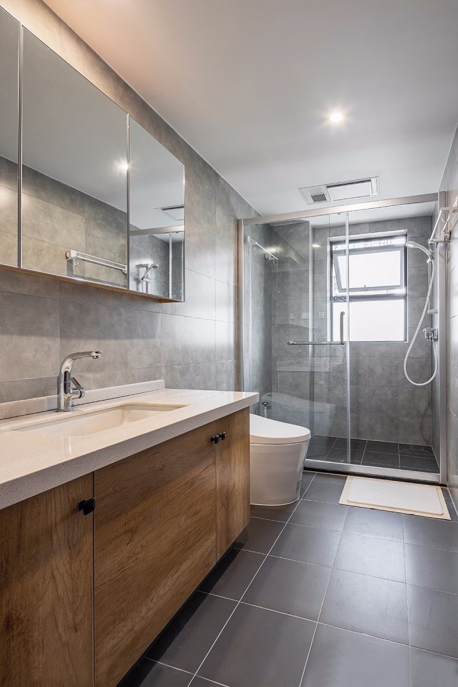 打通次衛(wèi)干濕分區(qū)的一堵墻,采用玻璃隔斷的設(shè)計(jì),既不怎么占用空間,視覺上也變得很寬敞。超大的浴室柜真的很實(shí)用,大面積的鏡柜方便收納各種瓶瓶罐罐。: