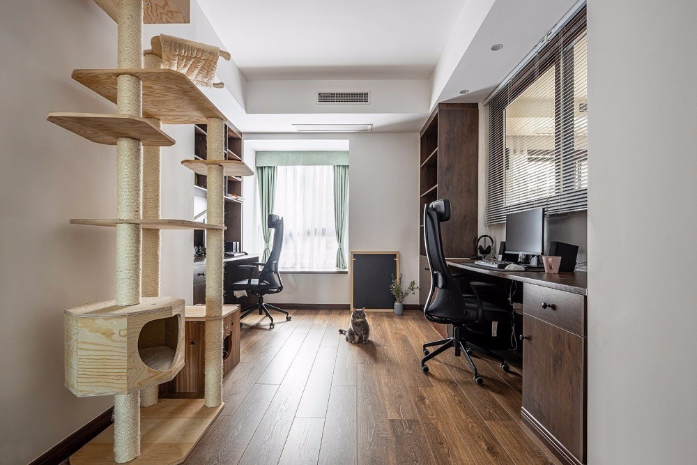 書房,貓爬架滿足了貓咪的娛樂,兩個(gè)書桌的設(shè)計(jì),為愛打游戲更愛工作的屋主提供一個(gè)自由而愜意的空間。書房與客廳打通之后,采光通風(fēng)都增強(qiáng)了不少。百葉窗簾具有良好的透氣性和隱私性,還可以提升空間的顏值與氣質(zhì)。