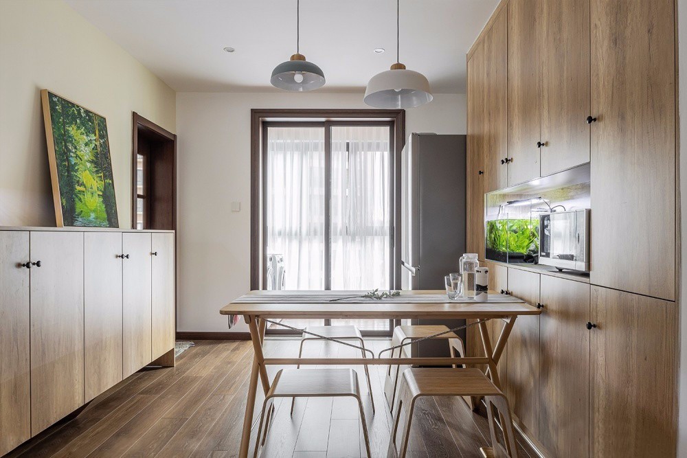 原木餐桌搭配簡單實(shí)用的紙片凳,簡約樸質(zhì)而又利落。餐邊柜中空的設(shè)計(jì),方便以后添置使用各種家電,提升幸福感與實(shí)用度。廚房墻面鋪設(shè)淺灰色六角磚,點(diǎn)綴藍(lán)色黃色與綠色,為空間增添了跳躍靈動(dòng)感。與木質(zhì)櫥柜完美結(jié)合,簡約自然中透露著精致感。