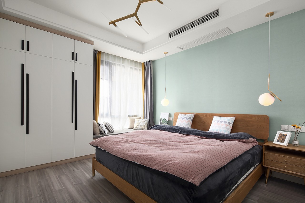 原木色布藝沙發撞色深藍色墻布的背景,突出木作家居給予空間的原生態環境