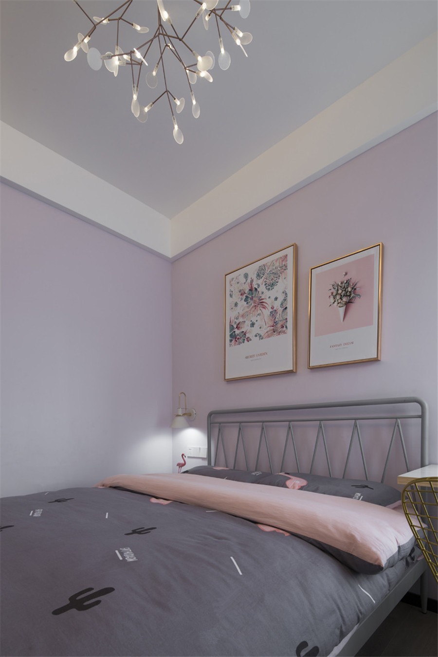 不同于主臥的素雅,少女心滿滿的女兒房, 床頭掛畫,鐵藝床與火烈鳥床單,INS風(fēng)十足。