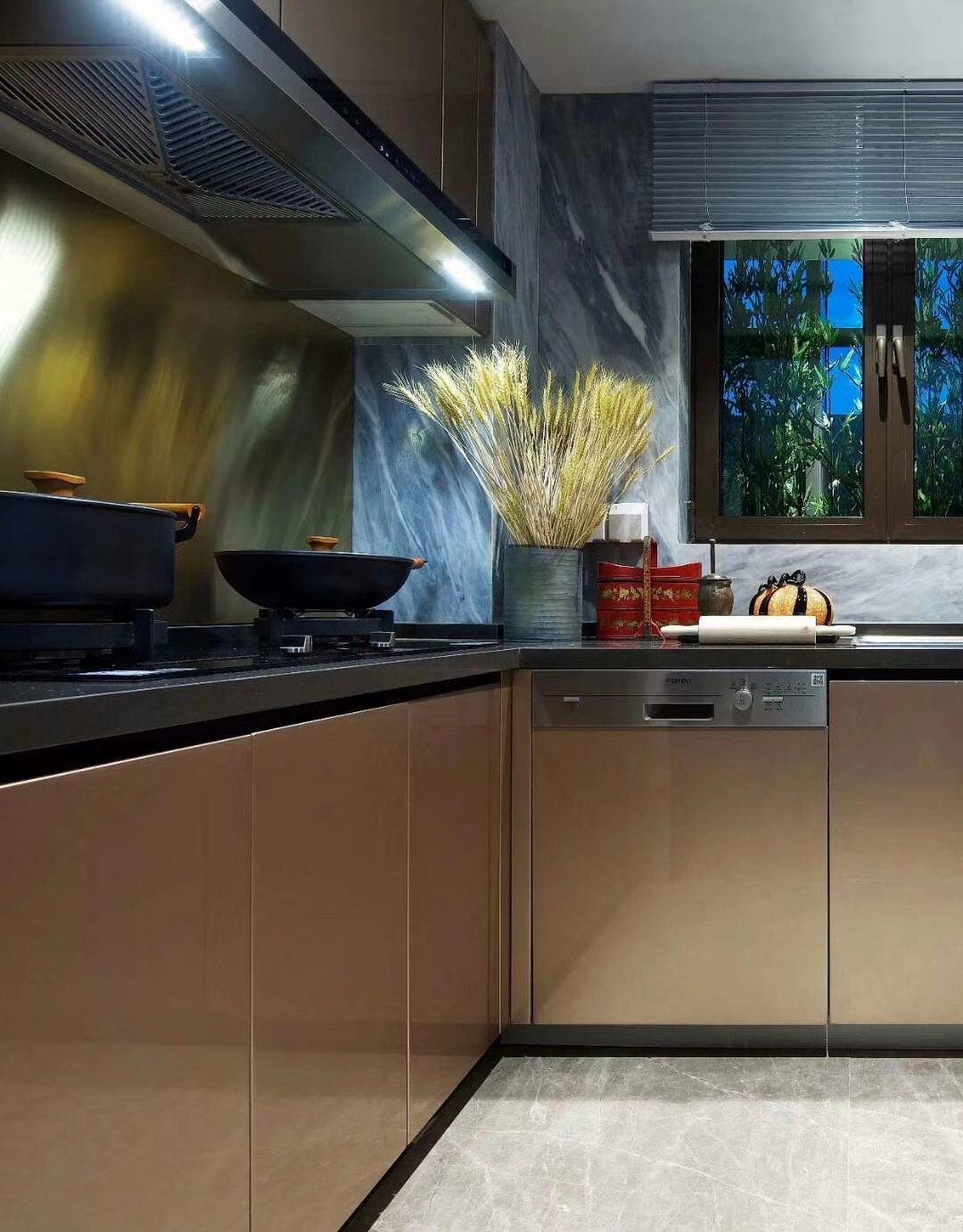 色彩搭配和琉璃亮金搭配更顯奢華,仿大理石瓷磚更凸顯古典泛