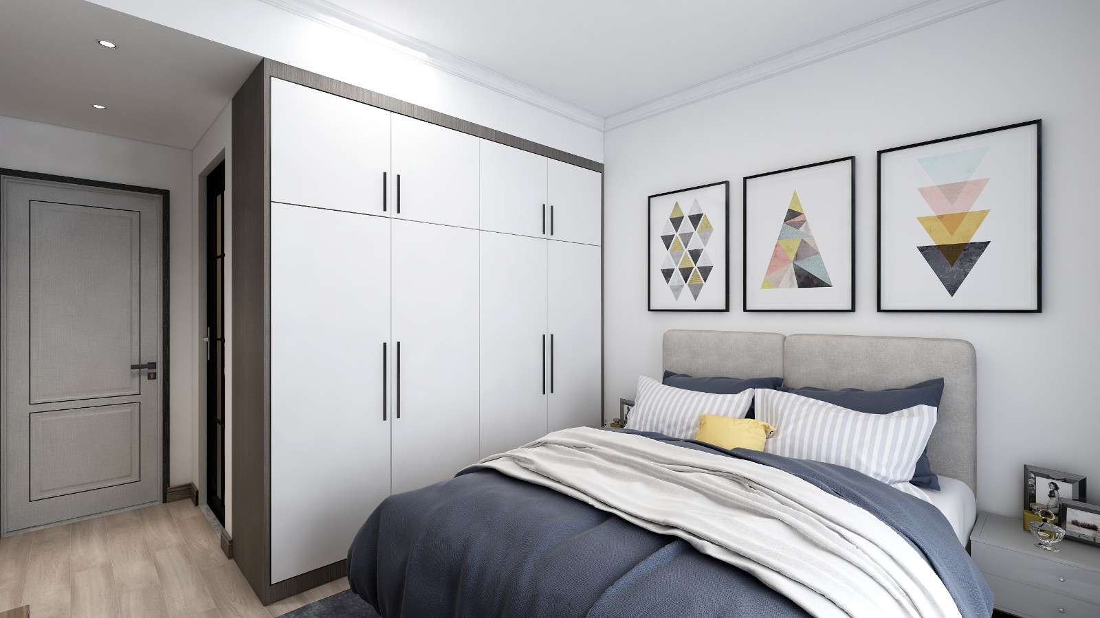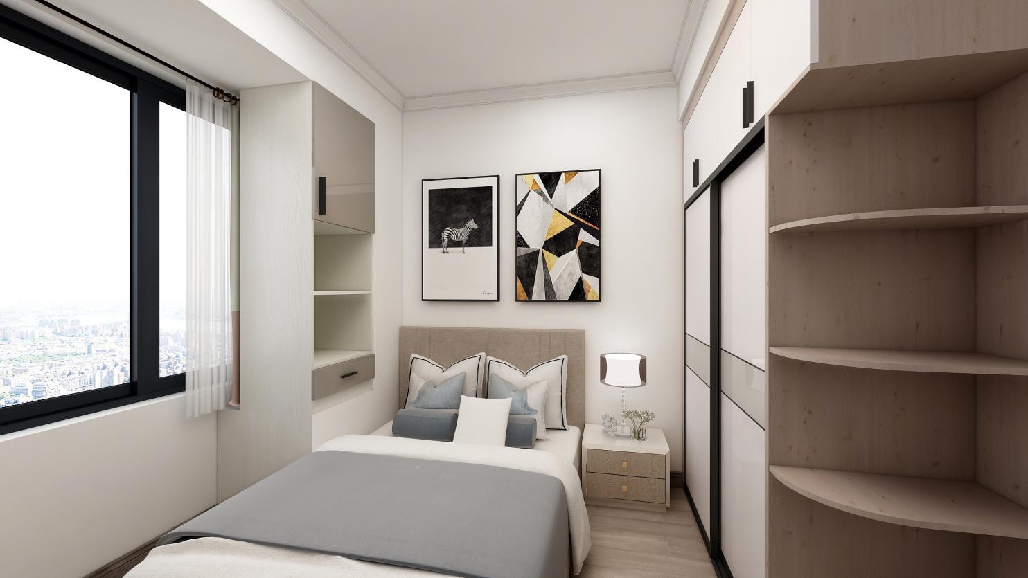 主臥室采用大面積留白,與裝飾掛畫結(jié)合,打破白色墻壁的呆板,營造出空間的層次關(guān)系。