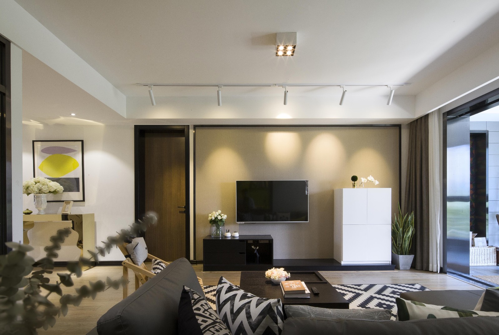 客廳后面是敞開(kāi)式書(shū)房,出挑的黃色沙發(fā)為空間帶來(lái)一抹亮色,